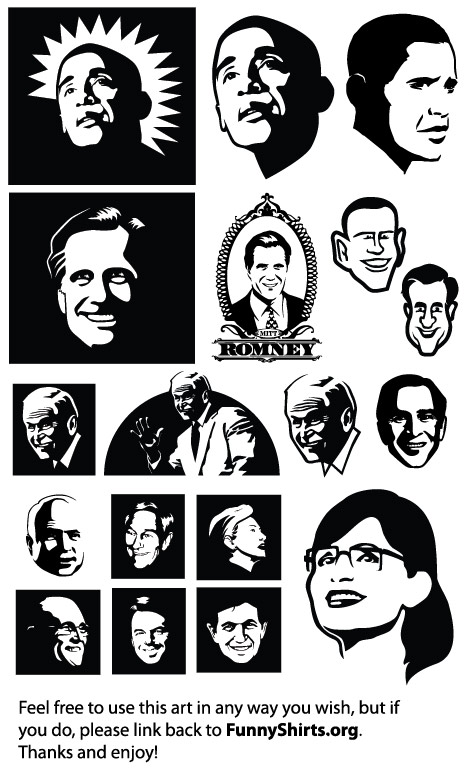 The designers at FunnyShirts.org have been busy creating some vector political faces art in anticipation of the upcoming election. They’re feeling extra patriotic and decided to share some of them with you for free! This art was originally created to be used on our political t-shirts. In fact, you can show your support for your favorite candidate and design Obama shirts or Romney shirts using our Design Center.