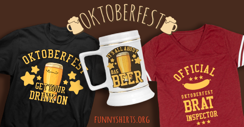 Steins, lederhosens, and the smell of sauerkraut are in the air. The combination of these three things can only mean one thing. That’s right, it’s Oktoberfest. Oktoberfest may of started in Germany but many Americans have jumped on the festivities bandwagon. People travel to different cities and prepare for this event weeks in advance. So why not take your celebration to the next level with a funny beer themed shirt or custom stein to show off your love for the German culture? FunnyShirts has put together a list of the best Oktoberfest shirts to make sure this festival will be one you won’t forget.