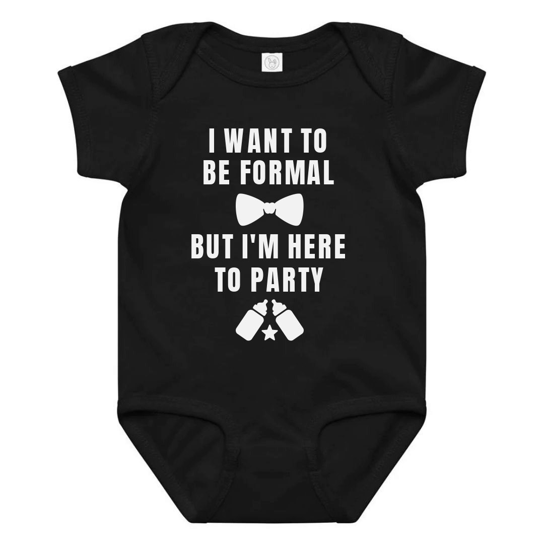 This baby is ready to paarrrttaaayyyy! This design features a bowtie with the text I Want To Be Formal and two bottles clinking with the text I'm Here To Party... but the bottles are baby bottles. Ha!