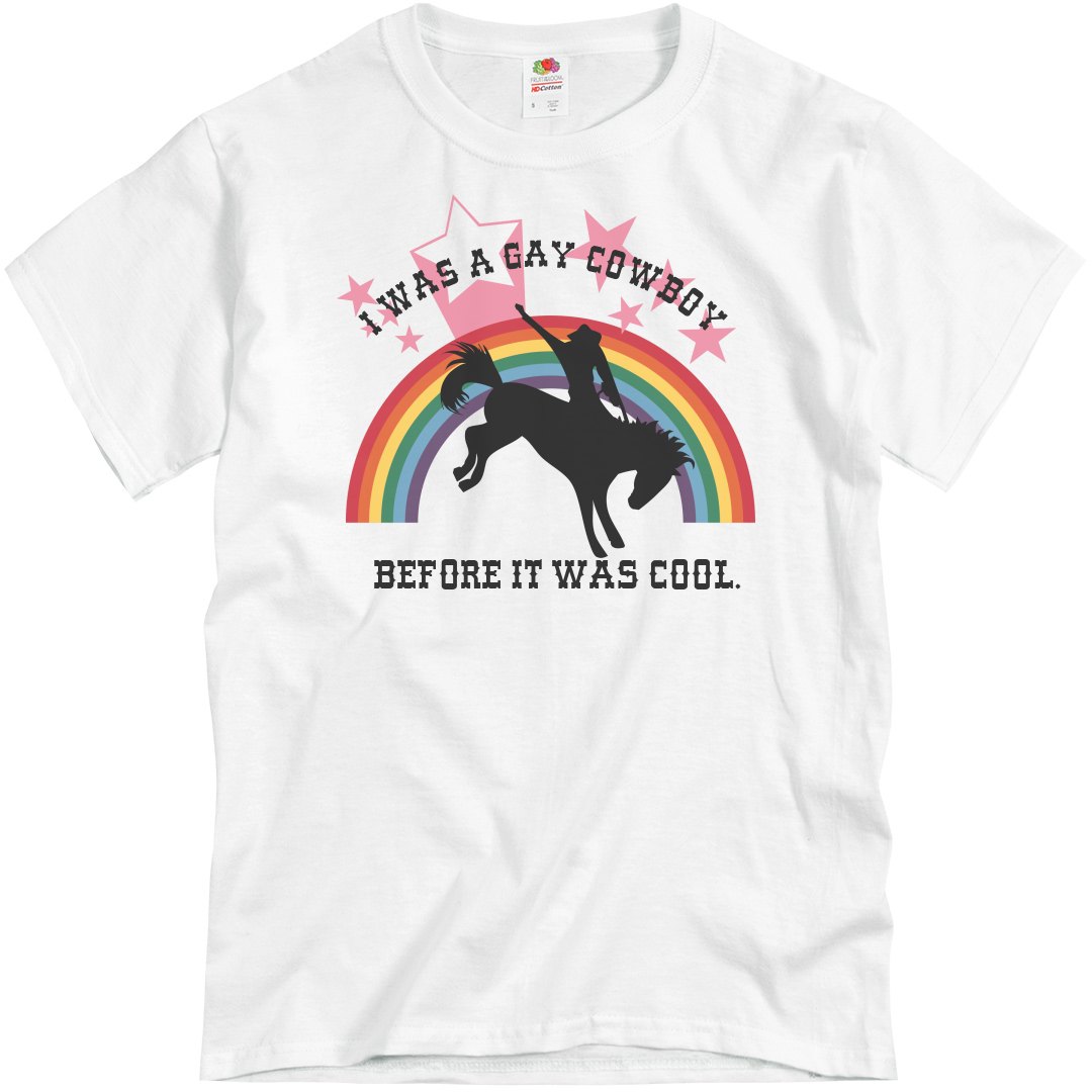 You might have seen a picture Jake Gyllenhaal wearing this shirt. Unfortunately, it was a photographic fakery, as Doc Brown would say. But it was still pretty funny. The shirt says: I was a gay cowboy before it was cool. All caps. Western font. Obviously.