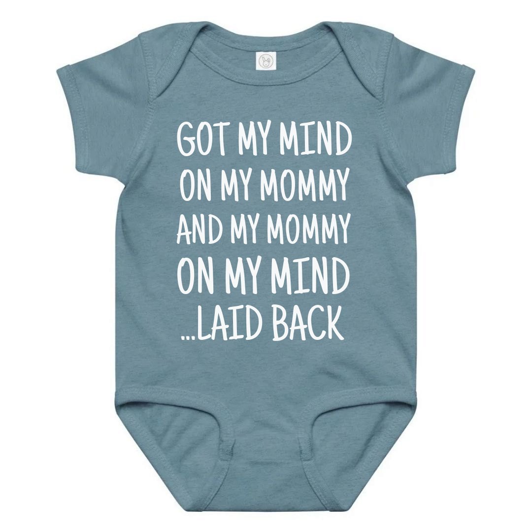 This is a great parody onesie because the word "mommy" substitutes perfectly for the word "money". Got my mind on mommy and my mommy on my mind. Laid back. Til I get a tiny bit hungry and then I cry and cry.