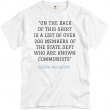 Allegedly, the back of this shirt has a list of known communist sympathizers. 200 of them. All working in the U.S. State Department. But whoa, what's this, the back is blank! What a ruse. McCarthyism was very bad, and if you want to celebrate the awfulness of the Red Scare, consider owning this shirt.