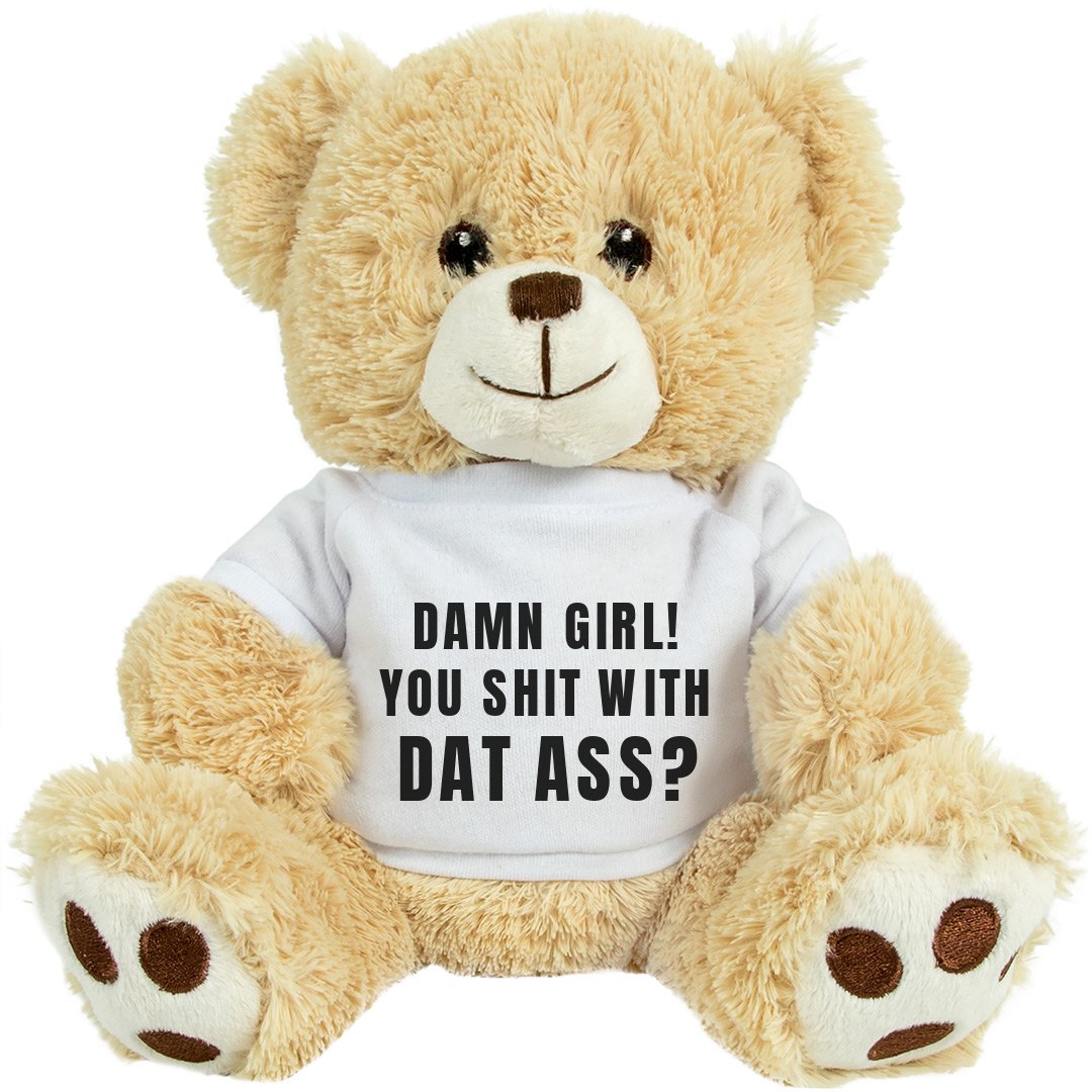 Damn Girl! You shit with dat ass? Uhhh. Yes. I do. You're not that good with pick up lines are you? Give your Valentine's Day crush this funny and dirty teddy bear and see if she feels the same about you.