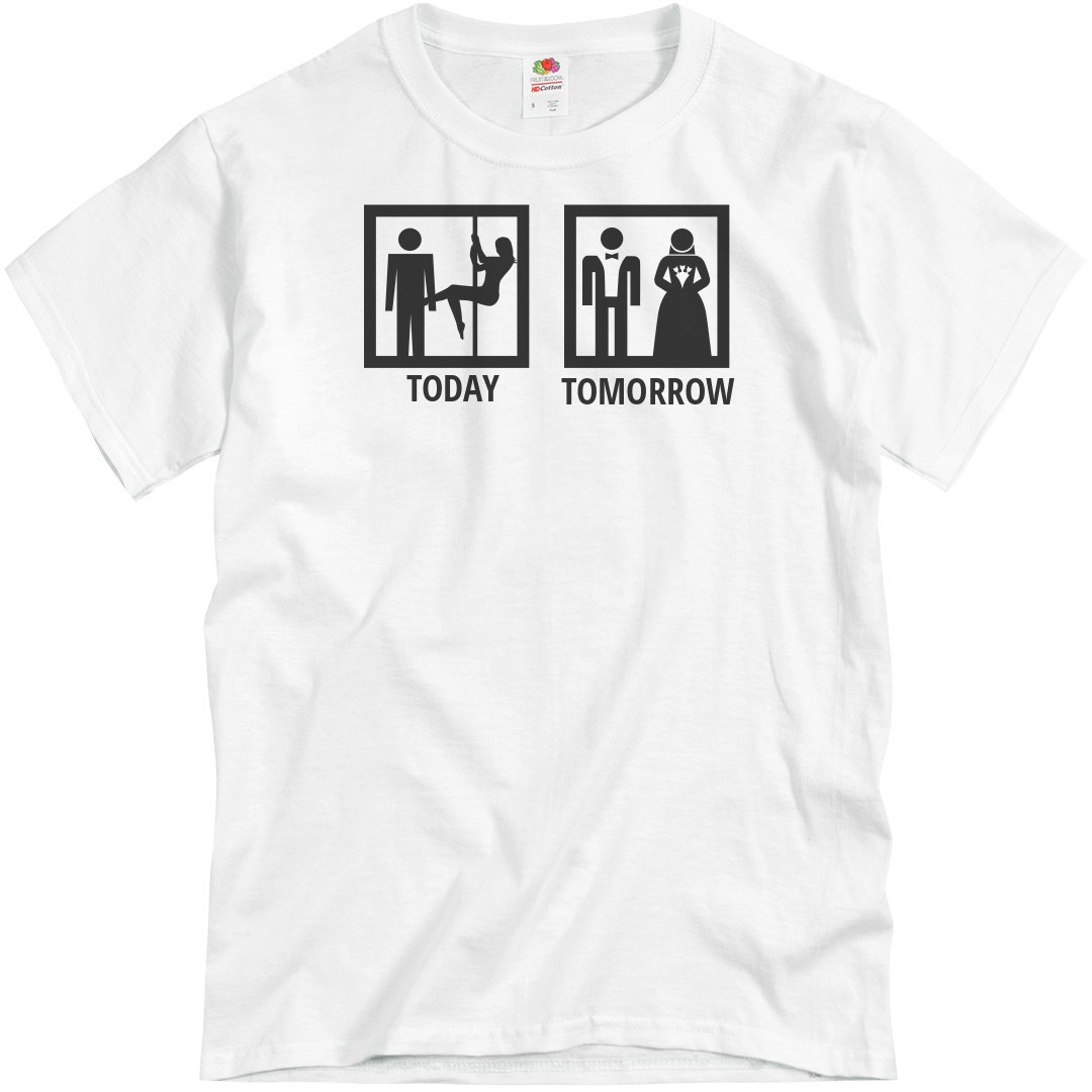 Live it while it's here. Today is represented in a simple graphic of a stripper dancing on a pole. Tomorrow is represented by the classic bride and groom graphic. Perfect shirt for the bachelor party.