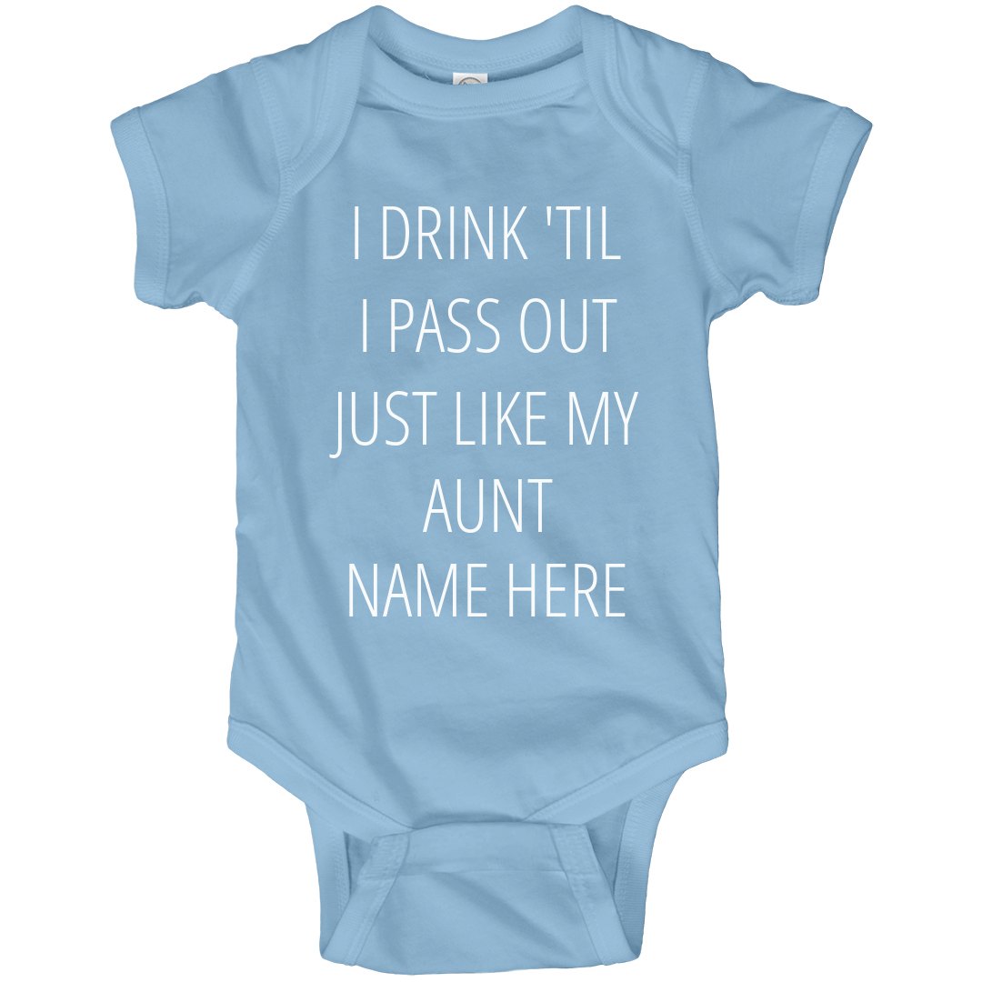 I drink 'til I pass out. Just like my aunt! Customize this funny baby outfit by adding in a name to bust someone's chops and make them laugh.